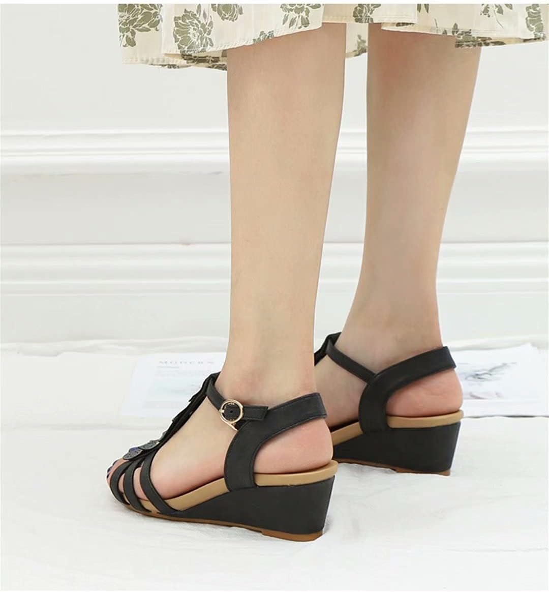 Bohemian Womens Wedge Sandals Casual Summer Rhinestone Beaded Platform Sandals Breathable Cutout Open Toe Elastic Band Dress Sandals Comfy Elastic Slingback T Strap Mid Heeled Beach Sandals