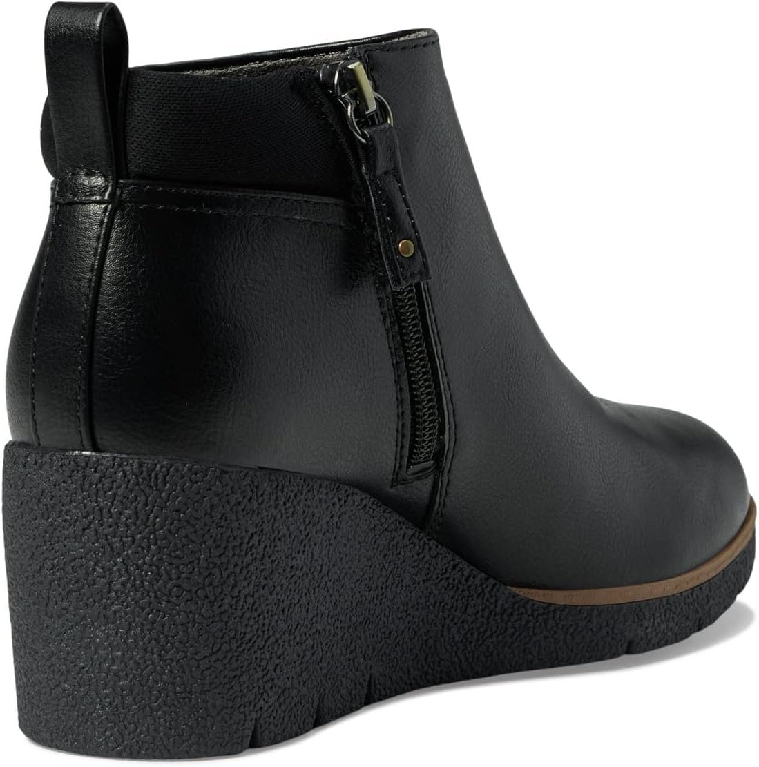 A Chelsea-inspired wedge bootie with style and flexibility.SUSTAINABLY CRAFTED: Eco-conscious fabric toe box, linings and topcloth made from recycled bottles, and heel counter made from recycled materials.MATERIALS: Faux leather or microfiber made from recycled plastic bottles.FIT: Slip-on fit with stretch collar, back pull tab, and inside zipper for easy on/off.SUSTAINABLE COMFORT: Insole technology with anatomical cushioning, comfort & support.MOVEMENT: Lightweight, flexible construction moves with you.STYLE: Casual ankle wedge bootie with 2 1/2 inch wedge heel.Casually cool, this wedge bootie features incredible comfort and standout styling.