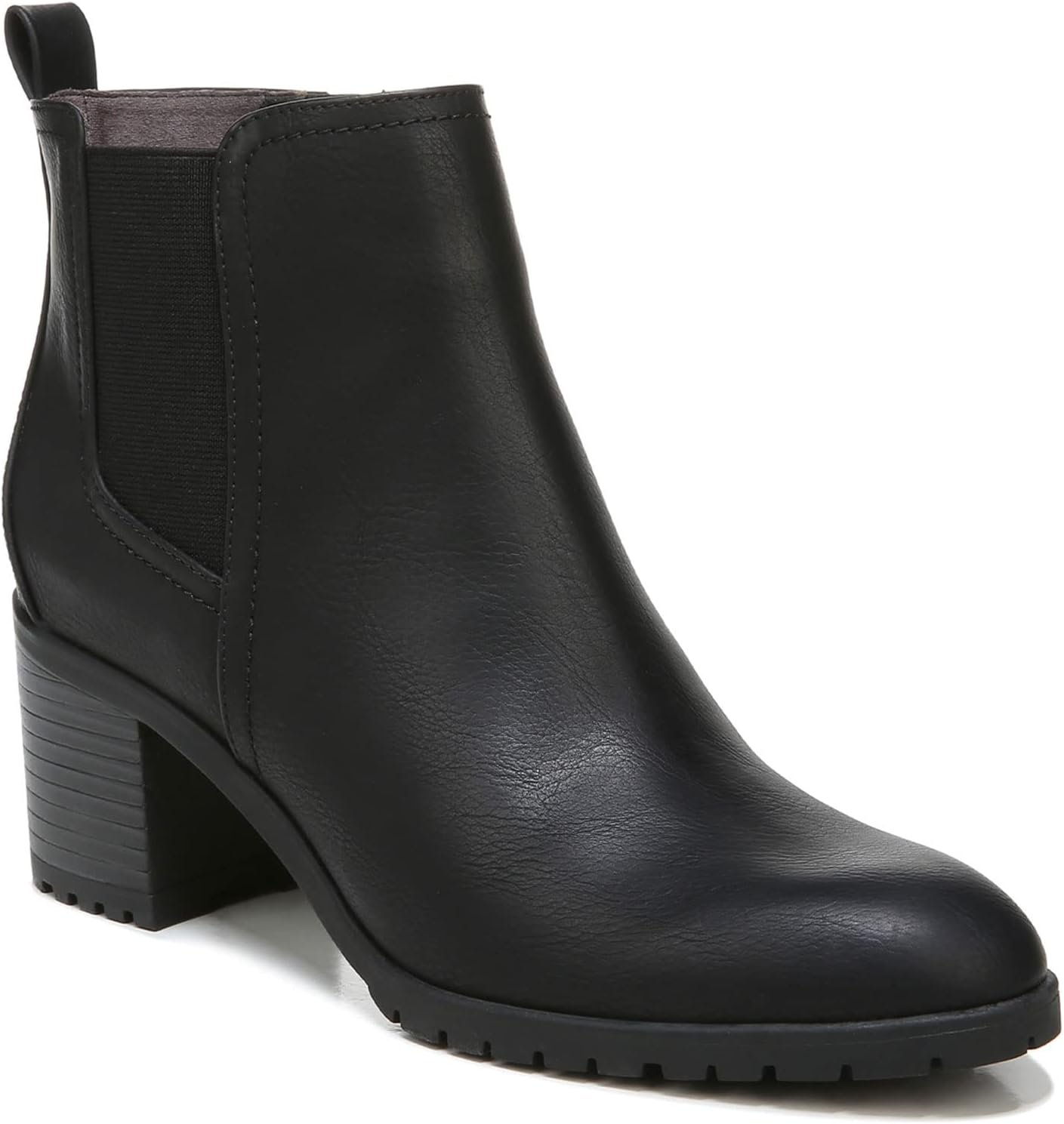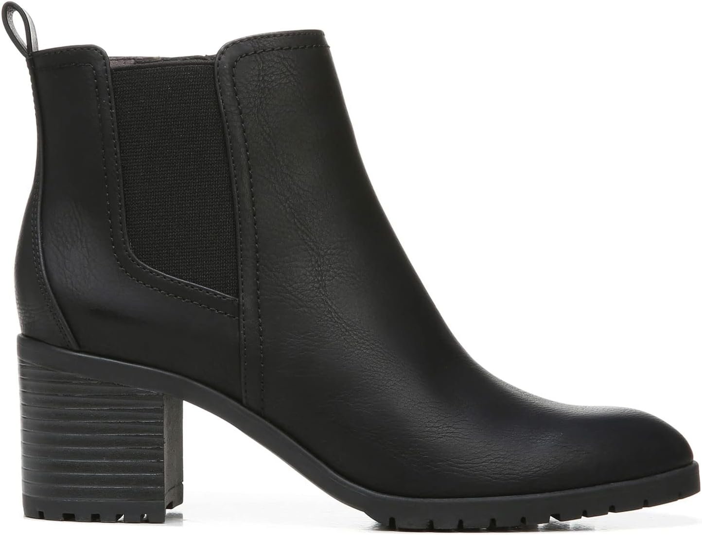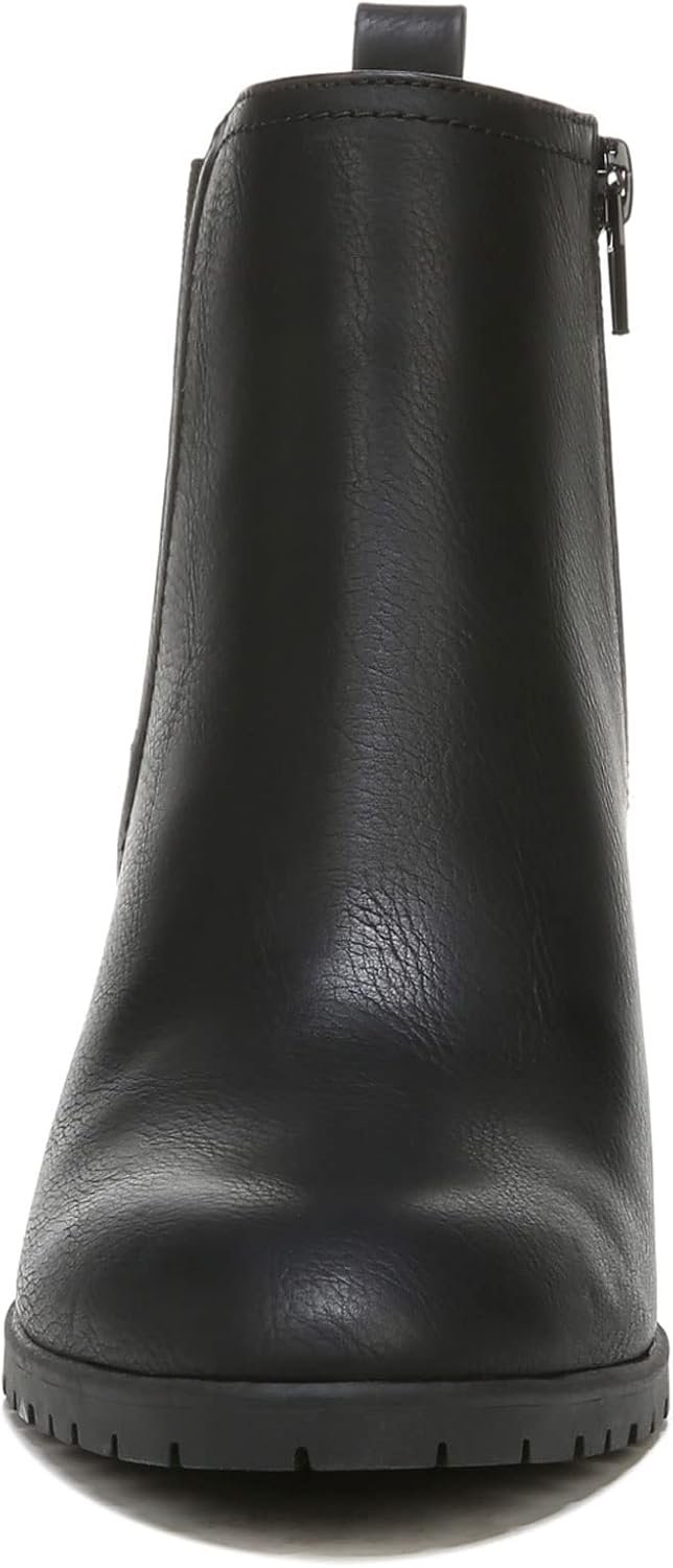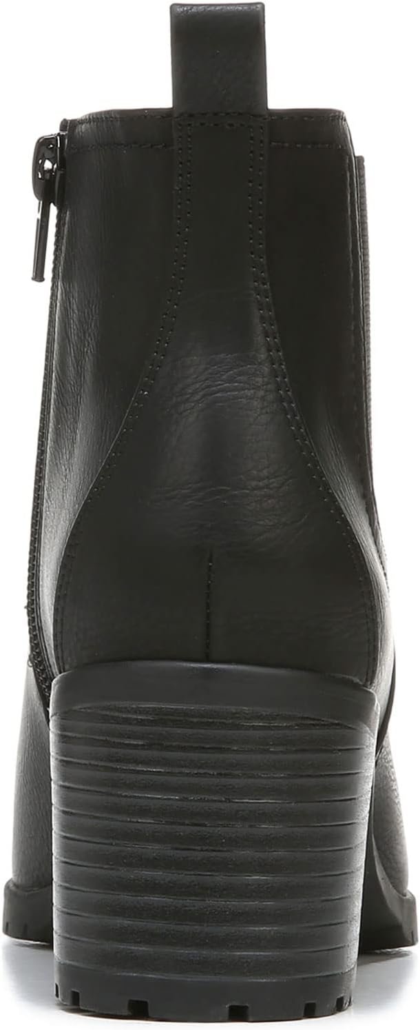 Sleek and sophisticated, this flexible boot pairs with everything from denim to dresses. Faux leather upper with round toe, inside zipper, back pull tab, stretch gore panel, and burnished design. Toe box, heel counter, and insole board crafted with recycled materials.