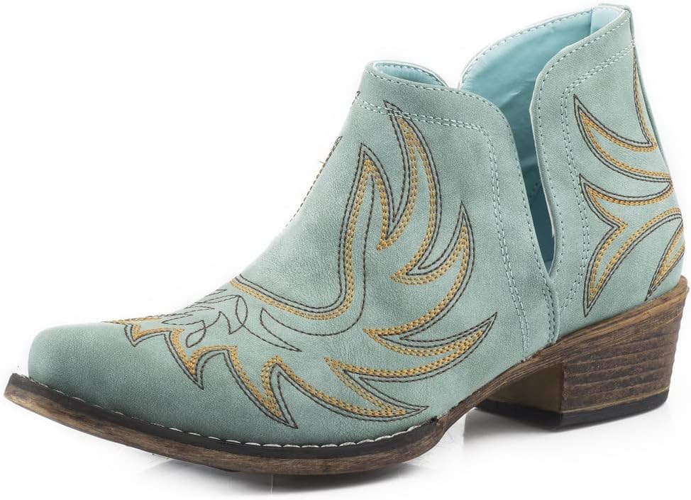 The Sleek Western look of the Roper Ava booties will complement both casual and a dressier looks. Faux Snake Leather. Tan Vintage Faux Leather Heel. Ankle boot with double opened sides.