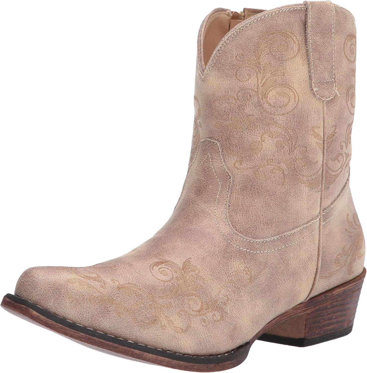 Roper’s Short Stuff Western Boot for Women is attractive footwear that features the traditional western appeal with synthetic leathers. Designed with a vintage faux leather upper and fabric lining for a fashionable look that women will be excited to add to their wardrobe. These women’s booties are made with comfort and durability in mind for those long days. There is a cushioned footbed and leather outsole, with a western heel. The snip toe adds the right touch to complete the look.