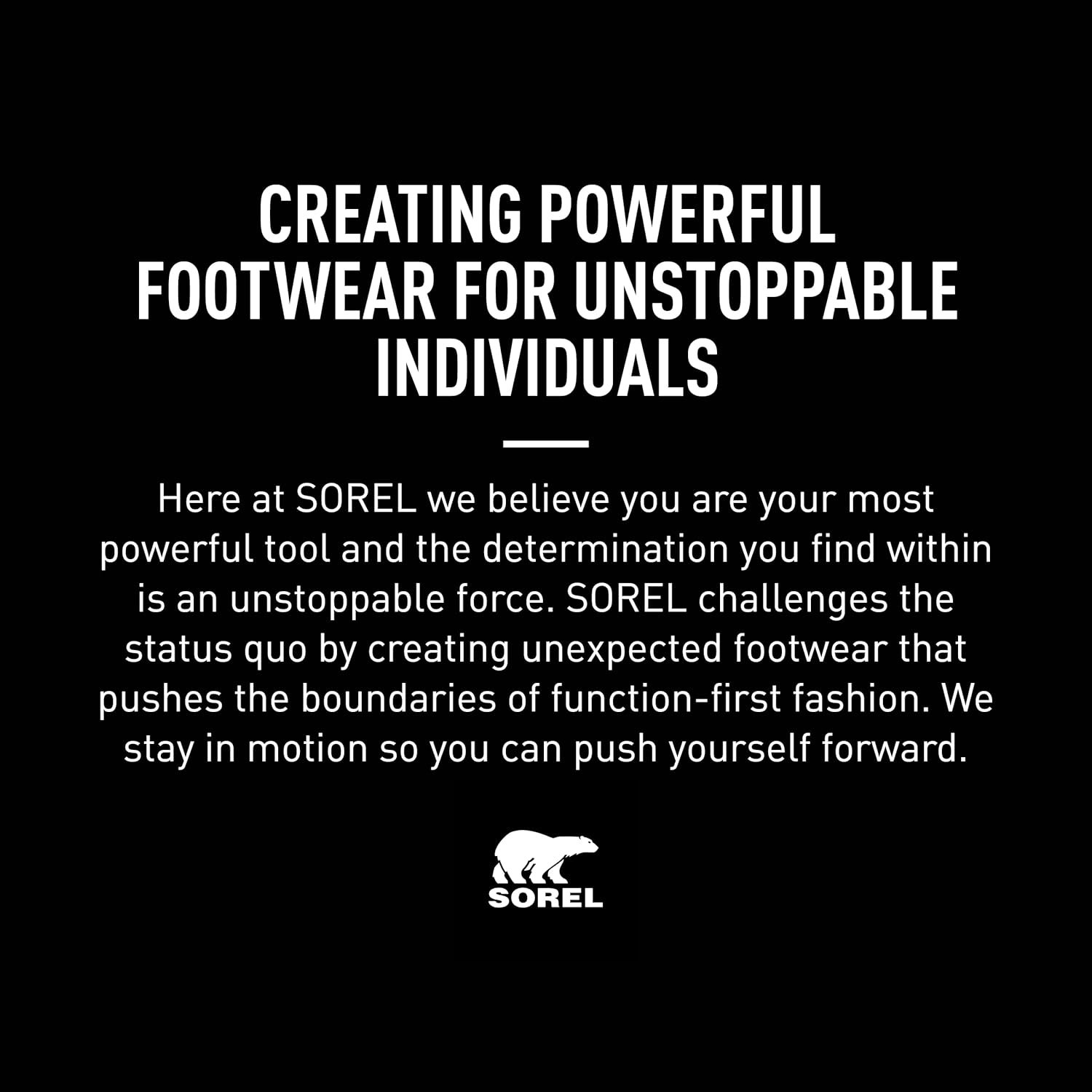 Founded in 1962, SOREL combines expert craftsmanship and of-the-moment design to create all-season footwear. What began decades ago with premium Boots, crafted with an unparalleled balance of construction and protection, is now a brand dedicated to both functionality and fashion. Here at SOREL, we believe you are your most powerful tool and the determination you find within is an unstoppable force. SOREL challenges the status quo by creating unexpected footwear that pushes the boundaries of function-first fashion. We stay in motion so you can push yourself forward.